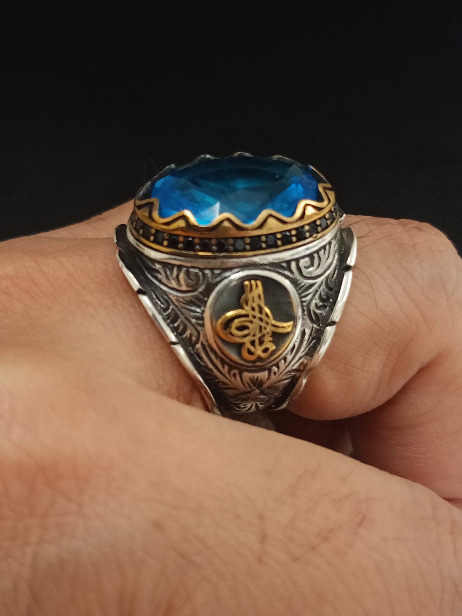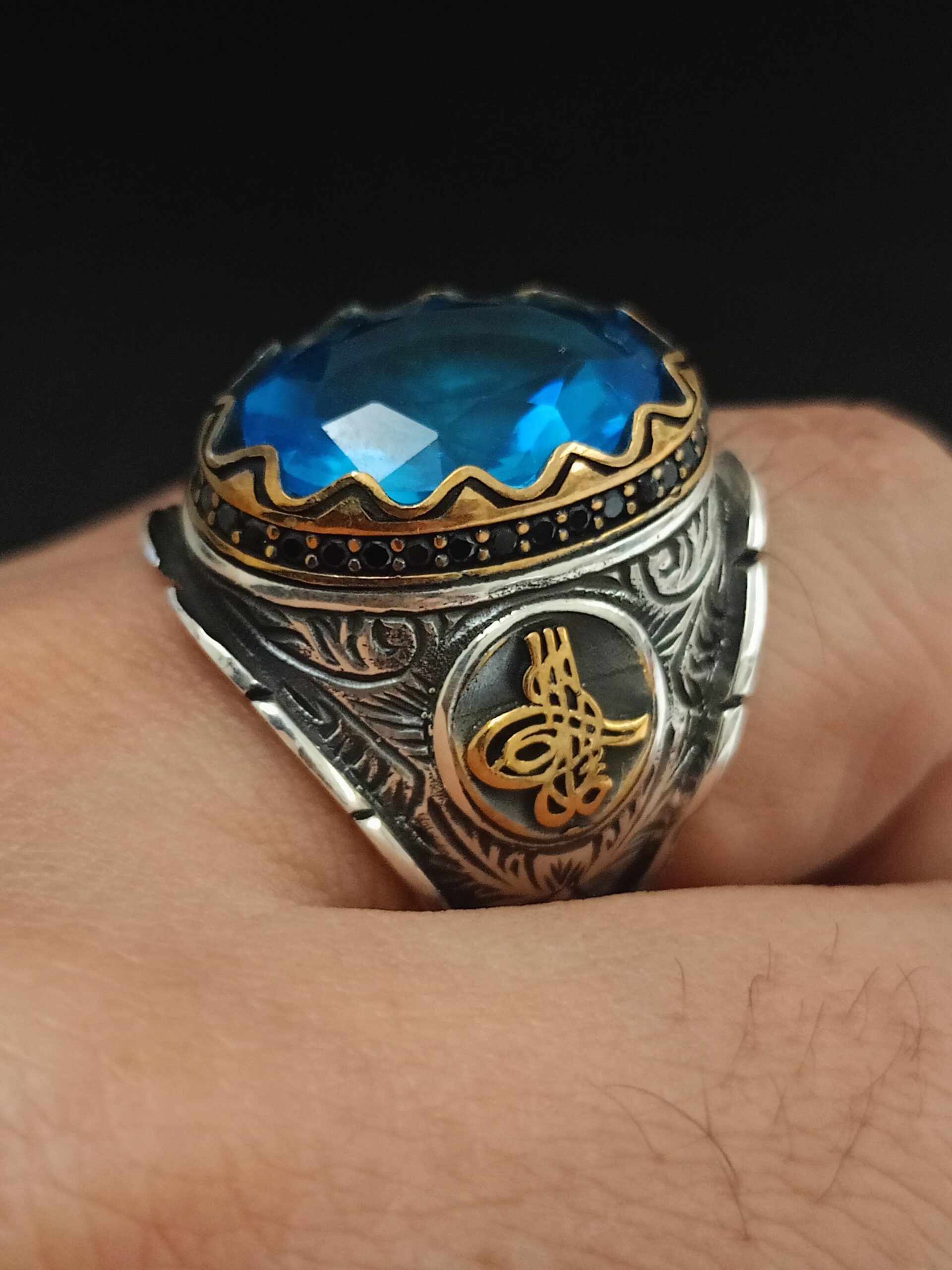 Aquamarin taşlı, yan kollarda Tuğra işlemeli üst düzey 925 ayar gümüş yüzük