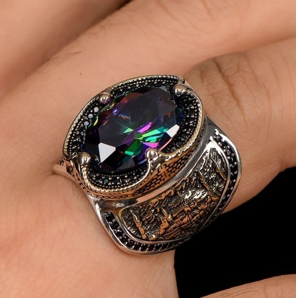 Mistik Topaz taşlı, kasasında Ayasofya Camii Şerifi kabartma işçilikli 925 ayar Gümüş Yüzük.